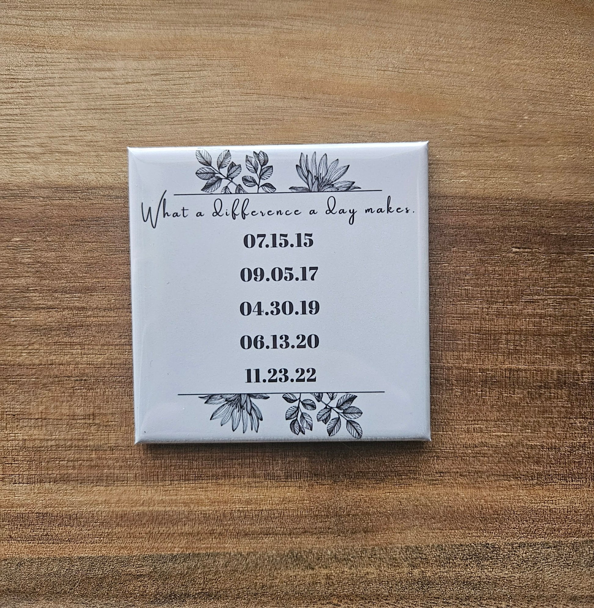 Each magnet is 2.5x2.5 inches, has a hard back and a glossy finish. In the "Order Special Instructions" box at checkout, please list up to 5 dates. The fewer number of dates, the larger the print will be. The more dates included, the small the dates will be. The magnet has a gray hue.