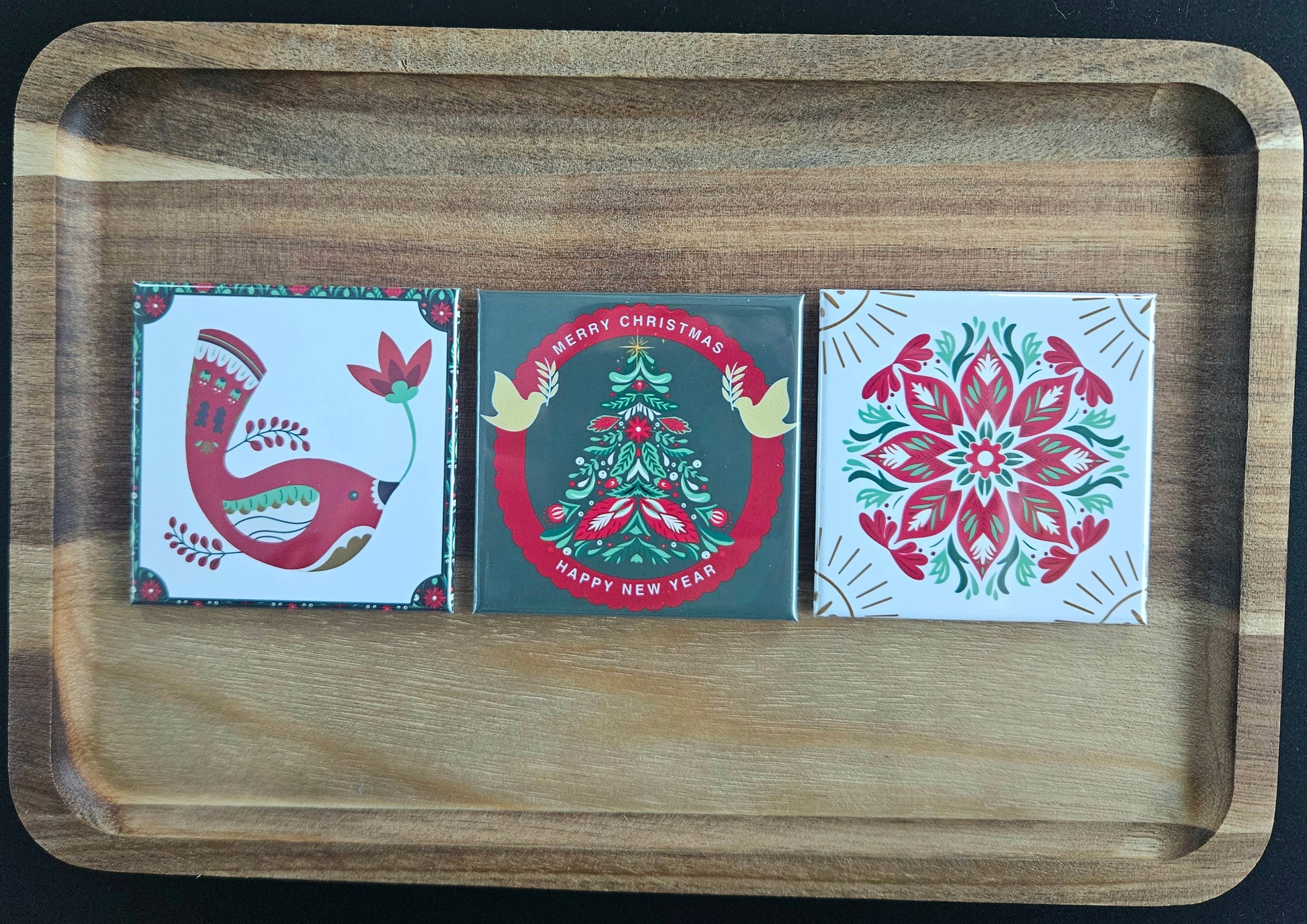 Folk art vibes in festive colors. A trio of red and green magnets with holiday charm.